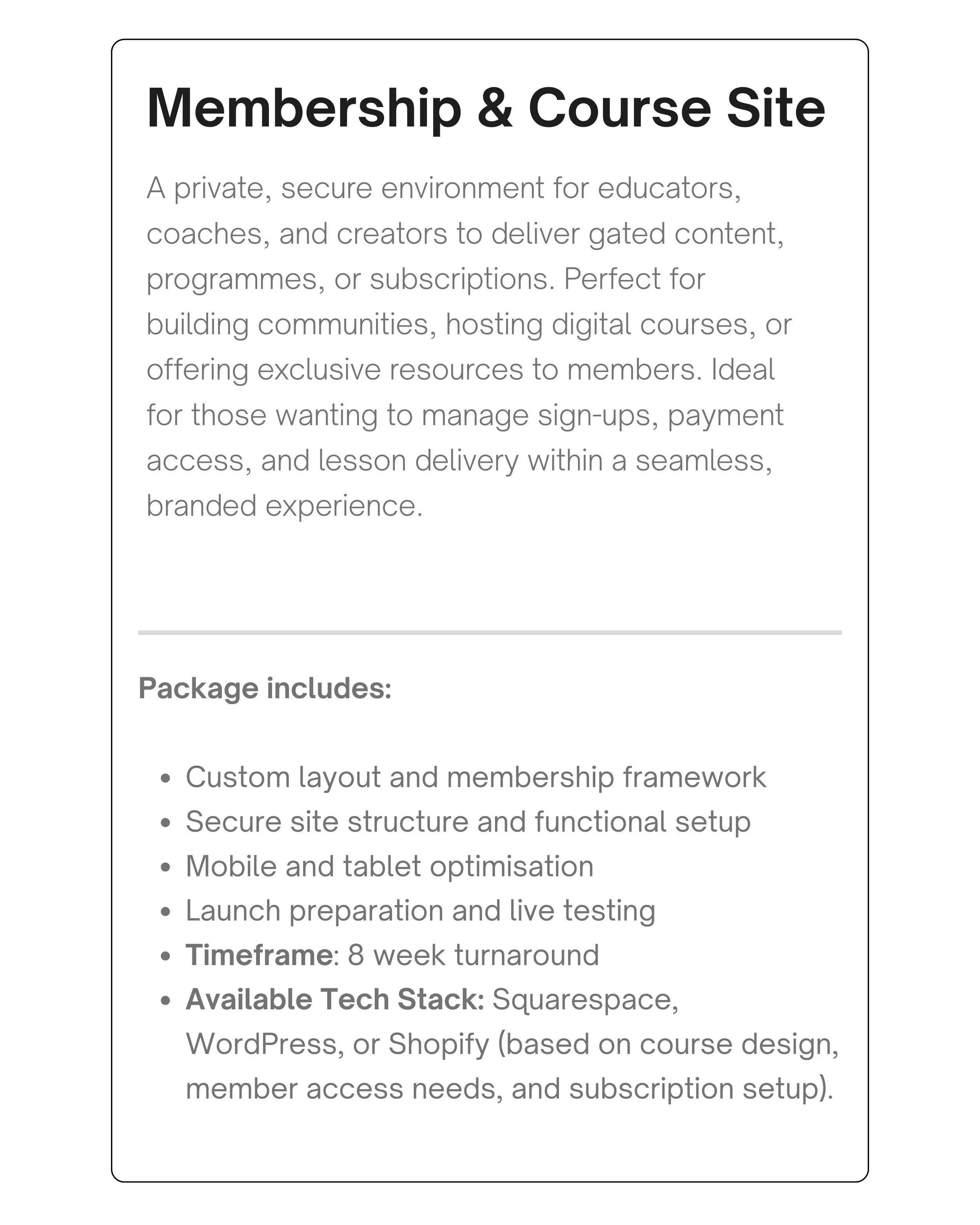 The prices listed are approximations, based on the tech stack we typically recommend to achieve your goals efficiently. Each site type includes unique integrations and setup requirements. Some integrations you may already have, others we’ll establish together. Certain subscriptions renew monthly or annually. Use this as a guide to understand the scope, structure, and investment involved and build your own budget. Choose the features that you need. And if you’re not entirely sure you can send us a message and we can help you.